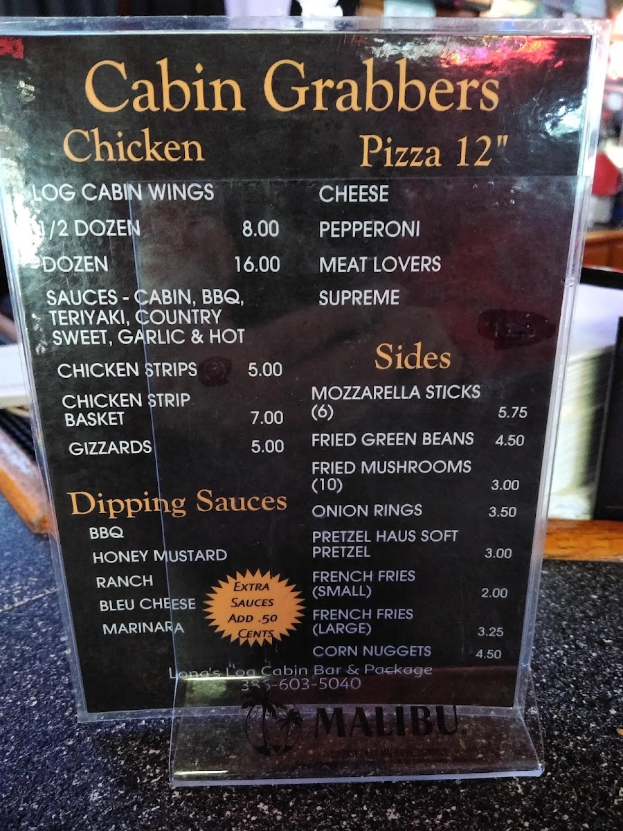 Welcome to Long's Log Cabin Bar & Package, a hidden gem located in Welaka, Florida, where the rustic charm meets a lively bar atmosphere. With an impressive menu that features the famed Log Cabin Wings, this establishment delights diners with a variety of sides including Mozzarella Sticks, Fried Green Beans, and Onion Rings. Each dish is crafted to perfection, ensuring every bite is a treat.